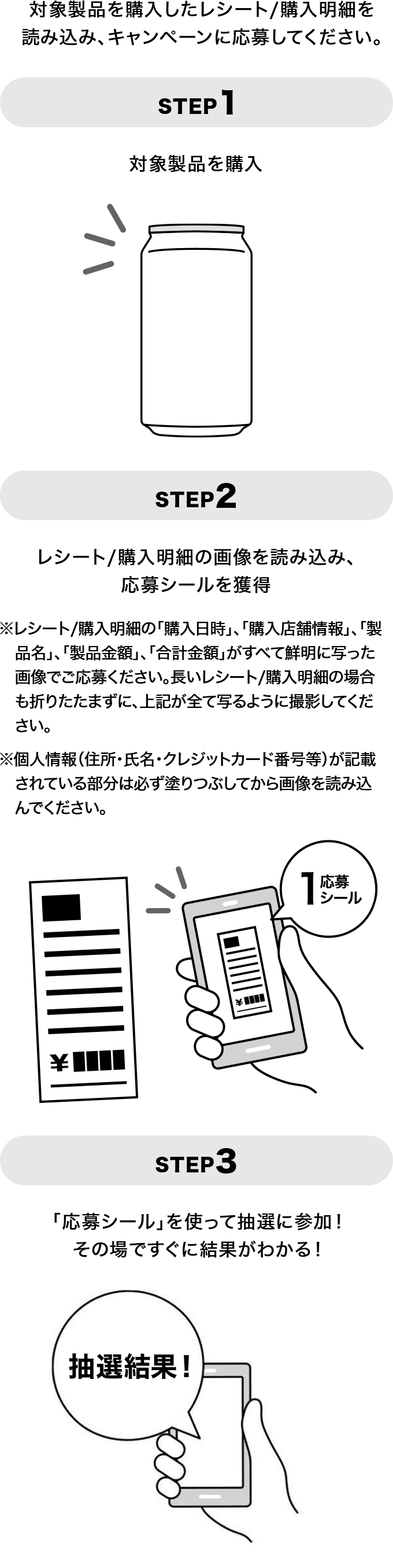 STEP2:マイページから購入本数を入力後、対象製品を購入したレシート/受領書を撮影し、送信してください。購入本数に応じて応募シールがたまります。