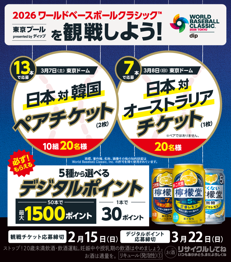 - ※2026ワールドベースボールクラシック™東京プールpresented byディップ観戦チケットコースに関しては、キャンペーン事務局側でレシート/受領書情報の解析に時間を要した場合でも、応募期間を過ぎての応募は受け付けできません。応募期間終了日付近では応募が集中し、レシート/受領書情報解析に最大10営業日程期間を要す場合がございます。また応募不備で、再アップロードが必要なこともございますのでレシート/受領書は余裕をもってご登録ください。