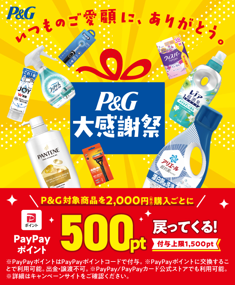 レシート有効期間中にP&G対象商品を1会計で2,000円(税込)以上購入したレシート/購入明細を、応募期間内にキャンペーンサイト上にアップロードすると、PayPayポイント500ポイント(最大1,500ポイント)が全員もれなくもらえます。