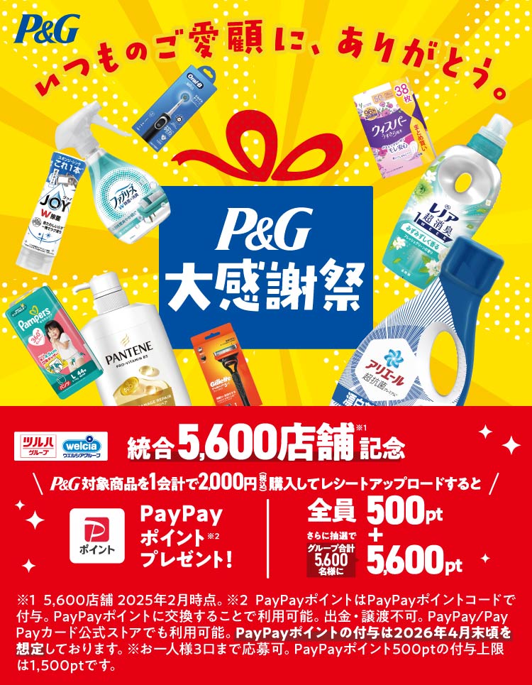 レシート有効期間中にP&G対象商品を1会計で2,000円(税込)以上購入したレシート/購入明細を、応募期間内にキャンペーンサイト上にアップロードすると、PayPayポイント500ポイント(最大1,500ポイント)が全員もれなくもらえます。さらに抽選で「PayPayポイント5,600ポイント」が5,600名様に当たります。