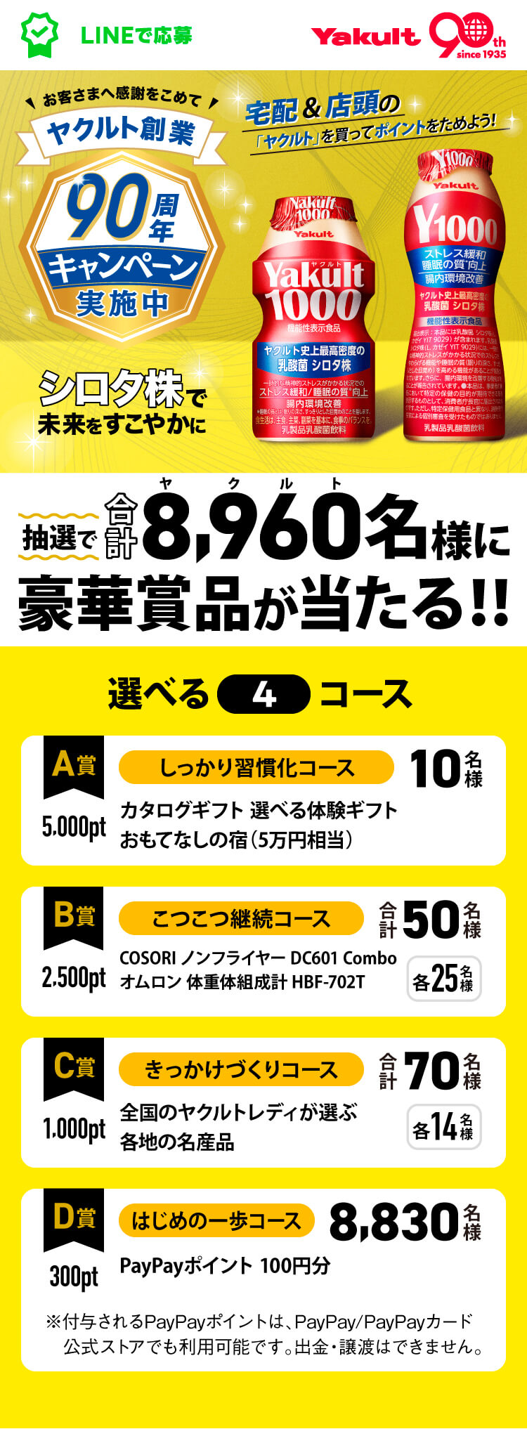 - ※対象商品は「Yakult1000」「Yakult1000 糖質オフ」「ヤクルト400W」「ヤクルト400」「ヤクルト400LT」です。
